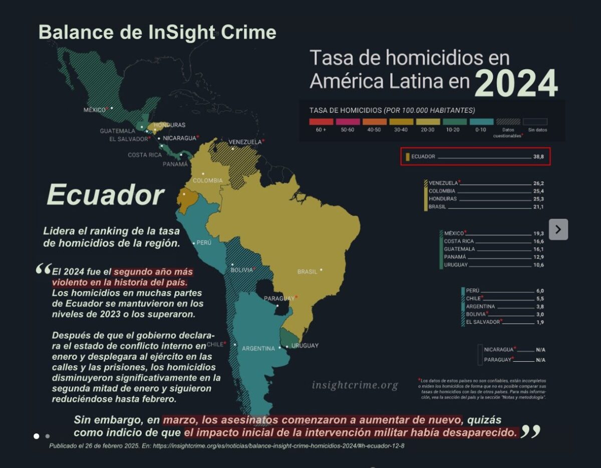 Ecuador fue el último país en la región en recurrir al despliegue militar para combatir el crimen organizado, pero, en lugar de frenar la violencia, este enfoque ha provocado la reorganización de los grupos criminales. En enero de 2024, tras una serie de atentados coordinados por parte de grupos criminales, Noboa declaró un «conflicto armado interno» y calificó de «terroristas» a los miembros de 22 bandas delictivas.
